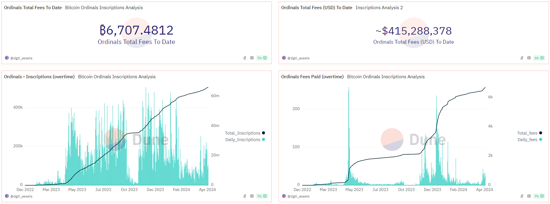 Data from Dune shows that demand for activity on Ordinals is increasing and showing signs of booming again based on the sudden change in the amount of Daily Inscriptions in the last week of March 2024.
